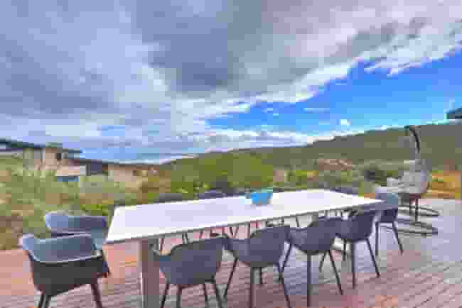 Embodying the pinnacle of style, this remarkable home can be best described in two words: Wow Factor. Featuring a sleek modern design, it showcases breathtaking water views from every room. Its northwest orientation provides stunning vistas of the majestic Knysna Estuary and the distant Outeniqua mountain range. Situated on a double stand, the property is fully fenced and boasts a level terrain, a rarity in the area. It is also equipped with a robust alternative energy system and an exceptional water storage system, making it sustainable and off-grid.
