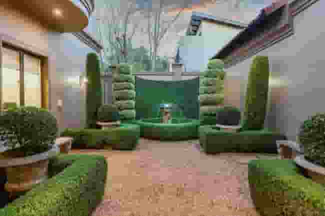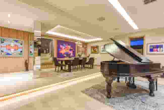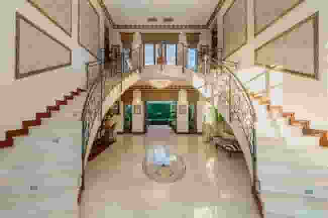 Curated luxury abounds in this pristine home showcasing an exceptional, fluid layout that encompass architectural brilliance, aesthetics and functional practicality. Impressive from the moment you arrive, the porte-cochère leads into the grand, voluminous entryway with elegant, double curved staircase, finished with a touch of antique gold, and out to the green courtyard and sound of cascading water beyond. Hallmark features include the vast, 3 meter high ceilings, marble flooring and the open-plan, palatial receptions comprising the formal lounge with a jet master fireplace, dining room showcasing a coffered ceiling and family/TV lounge with a unique ceiling fresco.