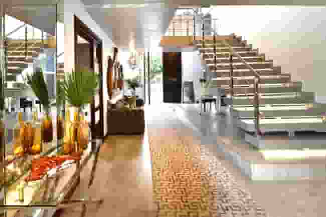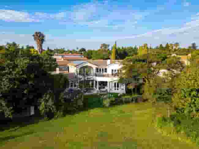 Positioned on an elevated stand with panoramic countryside views, this striking modern residence commands attention from every angle. The scale is immediately apparent, a beautifully proportioned home set within manicured gardens, rolling lawns and offering complete privacy. A sweeping driveway leads to an impressive façade defined by clean architectural lines, stone clad walls, glass balustrades and layered terraces. Floating Caesarstone stairs and exposed trusses create architectural theatre while expansive windows and open design invite an abundance of natural light throughout.